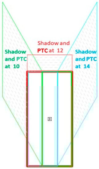 For the estimation of the shadow, the four corners of the concentrator are chosen. So, with known values of δ, Φ, H, and using Equation (12), it can be calculated the projected shadow (see Figure 10), where the shadow is calculated at 10, 12, and 14 h in continuous time. The outer contour of both shadows will be the envelope, these are shown in Figure 10, where the contours of full shadow at 10, 12, and 14 h have been represented.