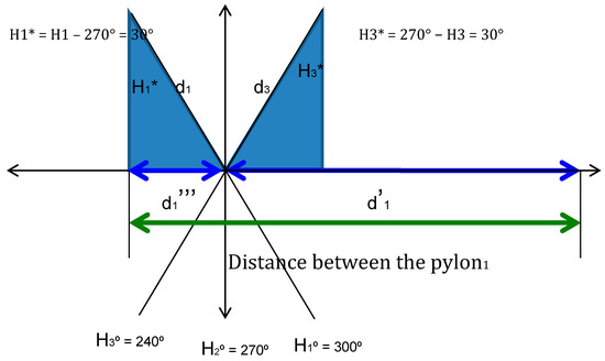 The data to be computed is the spacing between the rows of PTC lines or the distance between the pylon (see Figure 11), the triangle must be solved, whose vertexes are: shadow of the first hour, shadow of the last hour (third point), and the projection of the corner of PTC. The vertex angle P is (360 − (H1 − H3)), meaning the difference in the hour angles of the other two vertexes, and the sides from point P to first point and to third point are d1 and d3, respectively. Before for h1 and h3 are calculated the values of d1 and d3. Then, it is possible to determine an effective distance of shade considering the projection angle of the sun, as shown in Equation (14) (Figure 11),
