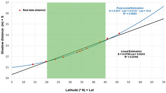 If the solutions that would be obtained with each model are represented. Figure 12 is obtained, where, the area marked in green, which is to say between 20 and 45 degrees north latitude, there is scarce difference between both models. Outside this area, the linear model underestimates the magnitude of the shadow and therefore its use would not be advisable. For example, at 14 degrees north latitude, the linear model underestimates the shadow by 25 cm, while the polynomial model underestimates it by less than 3 cm. In short, the results suggest the use of the polynomial model obtained for the calculation of the shadows since it offers very good results as it has an R2 greater than 99.8%.