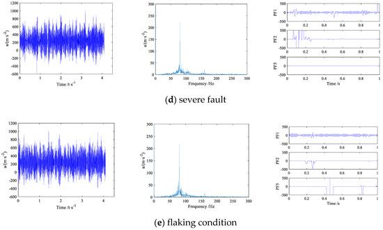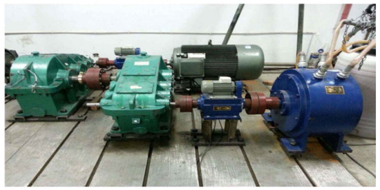 All the experimental data are obtained from the MFD310 system, as shown in Figure 2. This gearbox (reducer) is a three-stage transmission, consisting of four shafts, four pairs of bearings, seven straight gear teeth, and a box. The power source of this system is the motor. The input shaft of the first gear box is first connected to the first speed torque sensor and, then, connected to the motor. After the first gear box is decelerated, the output shaft and the input shaft of the second gear box are connected. The output shaft is connected to the second speed torque sensor after deceleration of the second gear box and, finally, connected to the eddy current brake. So that the location of the fault is relatively close and the required data can be accurately and sensitively collected, the vibration signals are collected respectively in five states of the gearbox, such as normal, slight fault, moderate fault, severe fault, and flaking. The frequency of shaft II is 7 Hz, the frequency of shaft I is 10 Hz, the sampling points is 4096, and the sampling frequency is 3387.77 Hz. The gearbox meshing frequency is 307 Hz.