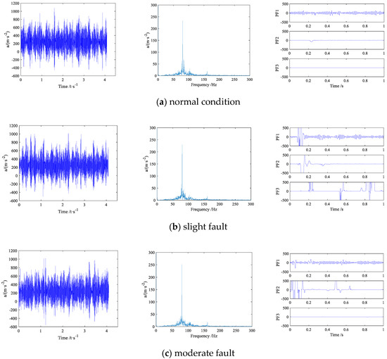 Five kinds of vibration signals for the same gearbox are collected respectively, and the time domain and Fast Fourier transform analysis are performed, which is chaotic, complicated. It shows a random distribution. Therefore it is almost impossible to judge the running state of the gearbox based on this. Therefore, this paper chooses the adaptive time analysis, Fast Fourier transform (FFT) analysis, and Local mean decomposition (LMD) to perform data preprocessing on the five states of the gearbox (as shown in the Figure 3). LMD preprocesses the vibration signals in the five states of the gearbox to remove interference factors such as noise.