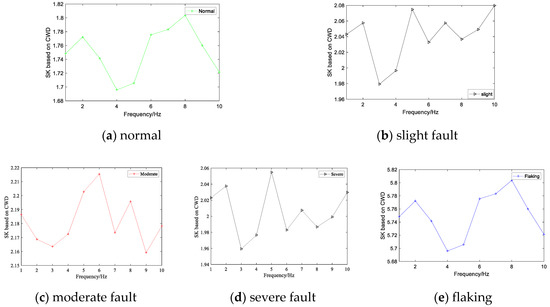 SK is a statistical tool. The non-Gaussian component in the signal is detected by SK. And the existence of the transient and its position in the frequency domain can be clearly pointed out. Once the gearbox fails, the frequency component of the faulty gear increases as compared with the normal state, so the amplitude of SK in the frequency increases accordingly.