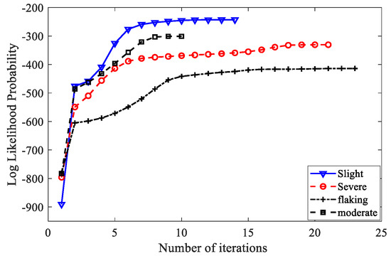 A total of 20 groups (five groups of each state) are selected based on the CWD-SK feature vector as training samples. Before training, the Lloyd algorithm is used to scalar the feature vector and the Baum–Welch algorithm is used for training. During the HMM training process, as the number of iterations increases, the maximum natural logarithmic estimate value continues to increase until it reaches convergence. After training, the HMM recognition models corresponding to four hidden states are obtained. All states reach convergence when the number of iterations is 20, and the convergence speed is fast.