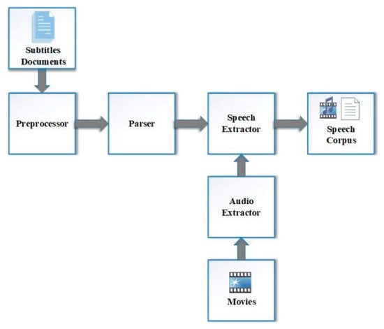 The output of the parser and the movie audio extractor are used as inputs for the speech-extractor module, which cull speech segments from the given movie’s audio. Before this process, audio information is extracted from film videos in the audio extractor module. In the speech extractor module, the speech information corresponding to the text information obtained by the parser module is extracted. The time interval of the speech information is provided at the beginning of each speech section in the subtitle document. The speech extractor process is performed according to this time interval information. The ID provided to the text file saved in the parser output is also given to the audio file in the speech extractor output. Thus, the necessary speech–text matching for the corpus was achieved.
