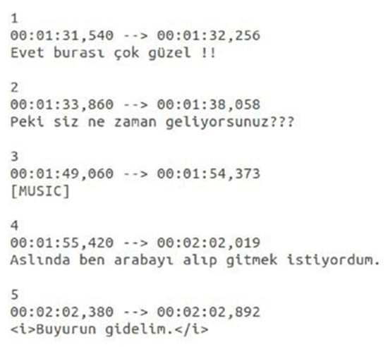 The goal of the preprocessor module is to convert each subtitle into a format that can be used by the speech recognition training tools for which the corpus is being prepared. Figure 2 presents an example of these subtitles for a Turkish movie.