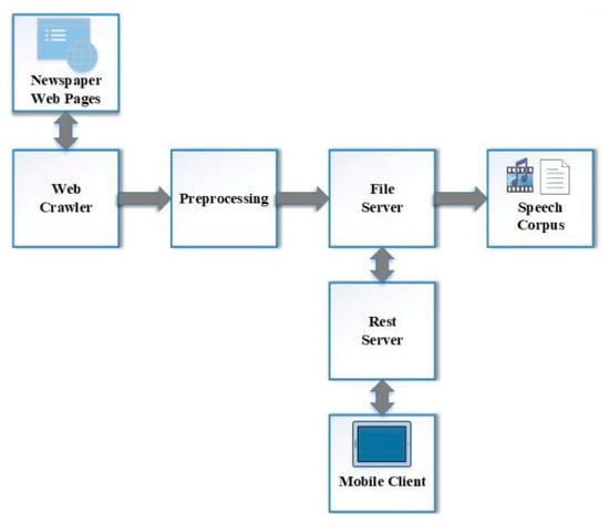 Turkish is an agglutinating language, and the vocabulary is very large. A corpus containing only speech from films would not be sufficient for general-purpose ASR. For this reason, a mobile application was developed to increase the size of the corpus and to obtain speech and text data in different areas (magazine, sports, technology, agenda, etc.). Figure 3 shows a block diagram of the operation of the main modules for mobile data collection applications.