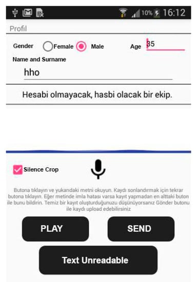 Newly published newspaper articles were obtained with the help of a web crawler. The web crawler module had access to the published Turkish-language newspaper web pages at specific times. This procedure was limited to once a day. The identified newspaper articles were sports, magazines, and general articles. The pre-processing module analyzed the obtained articles with the help of a web crawler as a parser. Attention had to be paid to the absence of word loss at this stage. Texts separated info sentences in the preprocessor module were identified and uploaded to the file server. A representational state transfer (Rest) application programming interface (API) running on the Rest server sent previously prepared texts to a mobile client [39]. The mobile client showed the text to the user and asked the user to read the text. The created audio file created was identified and transferred to the file server. Thus, the text and voice files the users vocalized were matched and stored. A screenshot of the mobile application developed in this study and used by the real users is provided in Figure 4.