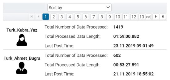 Statistical information was gathered via the information from the user provided by the mobile application, such as who logs in and how many sessions they log in, the last time they sent data, how much data they processed, and how long data they vocalized. This information was followed through the prepared web interface. We found that the users created approximately 55 min of voice recordings. Also, we observed that mobile users were aged 19–52 years and the average age of mobile users was 26. The collection of the corpus via the mobile application was completed in 86 days. The developed mobile application was used by a total of 130 real people (50 men and 80 women). A total of 120 h of speech data were obtained by this method.