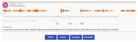 As seen in Figure 8, the users could check and verify the audio–text mapping. The users could correct the text provided to them and send it back to the file server. In addition, if noise, overlap, and uncertainty existed within the audio data, they could label the data according to the specified situation. As a result of the verification process, we obtained a corpus that was controlled by real users.