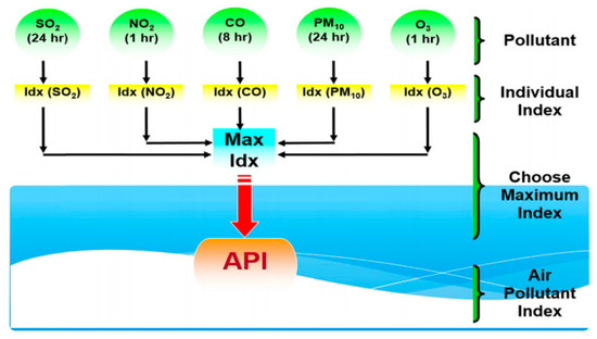 The air pollution index (API) data is classified based on the highest index value of five main air pollutants, namely, ozone (O3), sulphur dioxide (SO2), particulate matter (PM10), carbon monoxide (CO2), and nitrogen dioxide (NO2), as shown in Figure 1 [42,43,44,45]. The API values are determined by the average indices for these five pollutant variables, and then the maximum value from these sub-indices is selected as the API value [3]. In Malaysia, the air pollution index (API) has been adopted as a measure of air pollution conditions. The API is a simple number that ranges from 0 to ∞ to reflect the air quality levels that are related to the health effects [3,45].