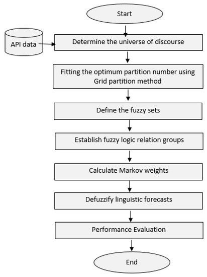 The FTS model is first introduced by Song and Chissom [18,19] based on a fuzzy set theory proposed by Zadeh [20]. Chen [21] developed the FTS model of Song and Chissom based on fuzzy logic group relations tables for reducing the computational complexity in the model. Huarng [22,23] developed Chen’s [21] model by determining the effective length of intervals. Yolcu et al. [24] developed the ratio-based method based on a constrained optimization to select the length of intervals. Yu [25] improved a predicting model based on weighted fuzzy relations, which produced better forecasting results than the Chen [21] model. Cheng et al. [26] introduced the trend weighted FTS model for TAIEX forecasting by assign proper weights to individual fuzzy relationships. Effindy et al. [27] modified a weighted FTS model for enrollment forecasting. They adopted the weighted model by adding the difference between the observed dataset across a midpoint of intervals. Tsaur [28] proposed the FTS model based on Markov chain, which is used for obtaining the largest probability using the transition probability matrix. He also used a random length of interval for the universe of discourse, which leads to a negative effect by abnormal observations and outliers. Sadaei et al. [29] developed a refined exponentially weighted FTS for forecasting the load data, which is developed prediction preciseness. More specifically, the effective interval length has been investigated by several studies based on different methods. For example, Huarng [22,23] proposed two methods for determining the effective length of intervals, which are based on averages and distribution. Yolcu et al. [24] developed Huarng’s model [22] based on constrained optimization for determining the effective length of intervals. Eğrioğlu et al. [30] proposed a new method of fuzzy time series using a single variable constrained optimization to determine the best length of interval for the best forecasting accuracy. Chen et al. [31] proposed a new FTS forecasting model integrated with the granular computing approach and entropy method for stock price data. Talarposhti et al. [32] proposed a hybrid approach using optimization techniques and intelligence algorithm to determine the proper length of intervals for predicting the stock market. Cheng et al. [33] employed a rough set and utilized an adaptive expectation model to propose a new fuzzy time series to forecast the closing price. Rahim et al. [34] developed a type 2 FTS model using the sliding window technique for determining the appropriate length of intervals. Bose et al. [35] proposed a new partitioning method with the rough-fuzzy method for developing the fuzzy time series model.