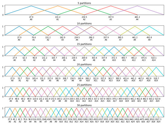 - Partition U for the observed data using the grid partition method [21,29] based on a different number of partitions, which are 5, 6, 7, 8, …, 50. But to avoid the redundancy, we present only 5, 10, 15, 20, 25, 30, 35, 40, and 45 numbers of partitions to determine the optimal partition number of partitions of the universe that can improve the model accuracy.