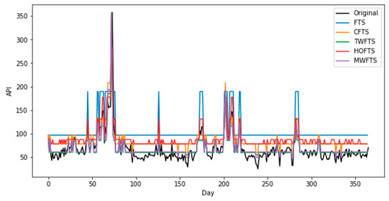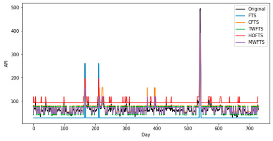 For validating the proposed model, the testing and training dataset of the APIs are used to evaluate the model performance and compare it with some of the famous existing models. Particularly, we introduce a comparison between the FTSMC model based on the optimal number of partitions and conventional FTS models that were proposed by Song & Chissom [18], Chen [21], Cheng [47], and Severiano et al. [48], which are FTS [18], CFTS [21], TWFTS [47], and HOFTS [48], respectively, to examine the performance of the proposed model. It can be seen from Table 7 and Figure 8 that the performance of the proposed model using the training dataset is very good. It has been performed with the smallest values of RMSE, MAPE, and U statistic as compared to other forecasting models. Thus, the proposed model outperformed the other forecasting models. This indicates that the proposed model is a powerful model for predicting air pollution occurrences. In addition, it could be seen from Table 8 and Figure 9 that the proposed model, using the testing dataset, outperformed the other FTS models. This implies that the model can produce a better forecasting accuracy of air pollution, which indicates that the proposed model can be modeled very well using any sort of time series.