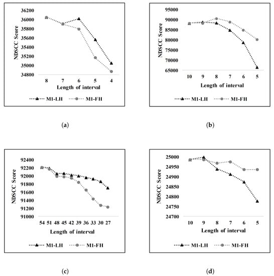 Figure 5, some interesting observations can be made as follows. It is observed that when the length of the interval is reduced, the NDSCC scores show a tendency to decrease. However, the decrease of NDSCC scores does not occur monotonically for all data sets in some cases. For example, case 6 achieves higher performance than case 7 for ElecNormNews data set on M1-LH. The same situation can be seen in the results of Poker and DS1 data sets according to