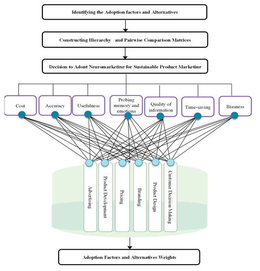 Considering the rapid advancement in neuromarketing techniques, there has been a rising interest in exposing the responses of brain to marketing stimuli caused by the introduction of consumer neuroscience in the neuroeconomics fields. However, marketing professionals are still doubtful about the adoption of neuroscience techniques as they are not sure about the ability of collected data to offer meaningful findings related to consumer behavior and psychology [35]. In addition, according to previous research on neuromarketing in sustainability development, neuromarketing techniques can contribute to the increased accuracy in sustainable product development, as well as improved ergonomics, decision-making, and sustainability processes. However, these issues are rarely investigated from the suppliers’ perspectives regarding why they intended to adopt neuromarketing techniques in their business. Therefore, this research investigated the adoption of neuromarketing techniques in sustainable product marketing from the suppliers’ point on view. In this regard, firstly, a review on the existing research on neuromarketing is conducted and the cost, accuracy, usefulness, time-saving, quality of information, bias, and deep probing of memory and emotions are identified as neuromarketing advantages that can significantly influence the adoption of this technique in business. Meanwhile, the contributions of neuromarketing in marketing research are classified into advertising, product development, pricing, branding, product design, and decision making. Next, a set of questionnaires is designed, and data were collected from green product suppliers who do the marketing of such products through online shopping websites. Fuzzy AHP is performed on the collected data to develop a new decision-making model for neuromarketing in the business context. The results show that accuracy and bias are two important factors that have a significant influence on green product suppliers in utilizing neuromarketing more specifically for advertising and branding purposes.