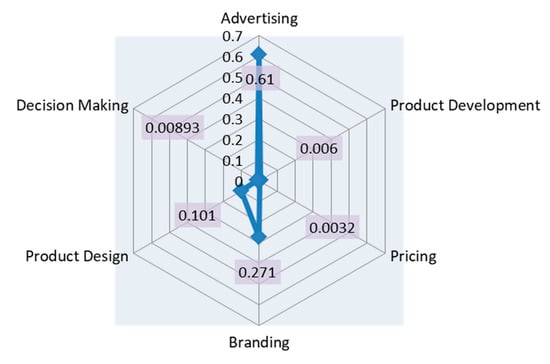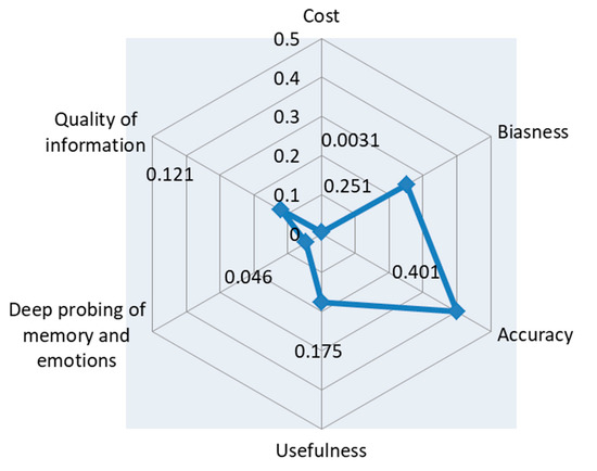 The fuzzy AHP technique was performed to obtain the weights of the criteria and alternatives through pairwise comparisons based on experts’ opinions using symmetric triangular fuzzy numbers. Then, the fuzzy numbers in the group judgment matrix were obtained. The results are shown in Table 4, Table 5, Table 6, Table 7, Table 8, Table 9, Table 10 and Table 11. Note that the inconsistency ratio of fuzzy pairwise comparisons was obtained by [100]. The final weights for the criteria and alternatives are provided in Figure 2 and Figure 3. The results show that the most important factors from the experts’ point of view were accuracy and biasness. In addition, the assessment of alternatives shows that advertising (weight = 0.61000) and branding (weight = 0.27100) are ranked as two neuromarketing contributions that make business managers more motivated to use neuromarketing techniques.