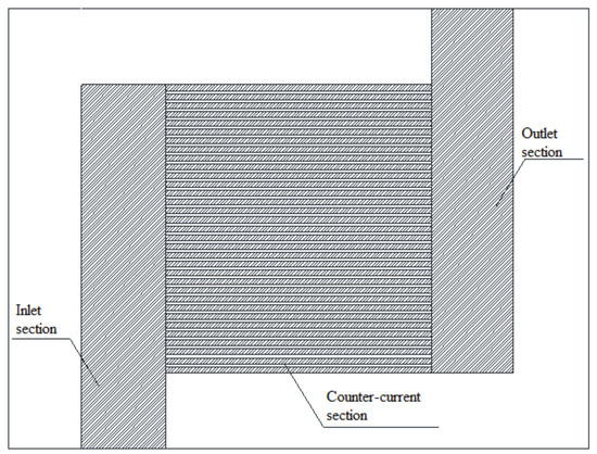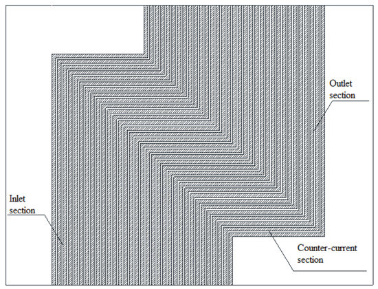 Due to the limitations of the processing technology and conditions, it is difficult to process large-sized PCHEs. Presently, the use of square plates is an effective way to improve the heat transfer power of a single heat exchanger unit. However, the inlet and outlet parts occupy a large heat transfer area in the nearly square plate using the traditional single-in and single-out flow, resulting in the area of the counter-current heat transfer part in the middle being very limited, as shown in Figure 1, and greatly influencing the heat transfer efficiency of PCHE. The use of a collecting flow in the inlet and outlet will greatly reduce the space occupied by the inlet and outlet parts which, in turn, will maximize the length of the counter-current heat transfer part, as shown in Figure 2. The flow distribution was very inhomogeneous on the heat exchanger plate between the inlet and outlet, due to the different pressures of the different channels, which will lead to a significant decrease in the heat transfer efficiency of PCHE and an increase in the flow resistance [19].