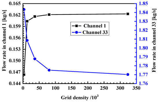 For the grid-independence verification, five numerical calculation steps with 1, 0.5, 0.3, 0.2 and 0.1 mm were carried out in this paper. As shown in Section 2, the numerical model had 33 channels in the counter-current section. Figure 4 shows the flow rate variations of two representative channels (1 and 33). It can be seen that, when the grid number reached 80,850 with a step size of 0.2 mm, the results changed a little (<1%) with the increase in the grid number, which means a step size of 0.2mm was small enough for this numerical model. Therefore, a step size of 0.2 mm was used in the subsequent calculations.