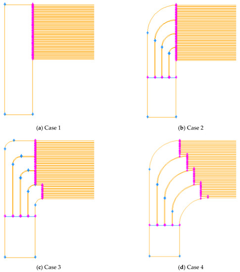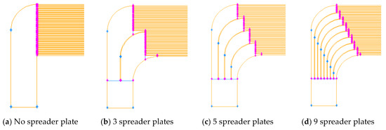 In order to improve the uniformity of traffic distribution in the channel, this paper studied the flow distribution characteristics in different cases, as shown in Figure 5. The parameters of the different cases are shown in Table 2. Case 1 used no spreader plate. Case 2 used the spreader plate with an increase in the inner and outer radius. Case 3 used the spreader plate with an equal inner and outer radius. Case 4 used the spreader plate with an equal inner and outer radius, also with a large bending radius.