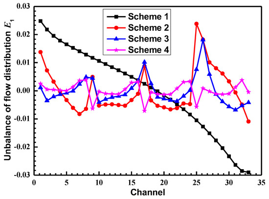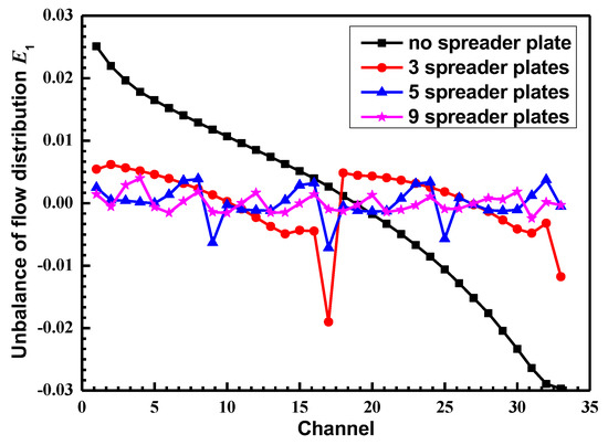 Figure 11 shows the flow distribution in the channel with different numbers of spreader plates. It was shown that with an increase in the spreader plates and partitions, the imbalance of the flow distribution in the channel was greatly improved. When the number of spreader plates reached nine, the imbalance of the flow distribution was reduced to ±0.2%.
