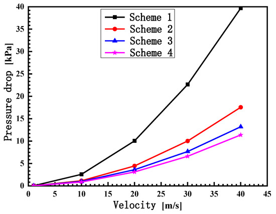Figure 9 shows the variation in pressure drop between the inlet and outlet with different velocities. Compared with Figure 6, Figure 8 and Figure 9, the pressure drop was great in Case 1 due to a very serious flow separation, which caused an inhomogeneous flow distribution. When the spreader plate was added in Cases 2 and 3, the flow separation improved and the flow distribution was more uniform, so the flow resistance was greatly reduced. There was barely any flow separation phenomenon in Case 4. The flow distribution uniformity in this case was the best. Therefore, the flow resistance was also the minimum.