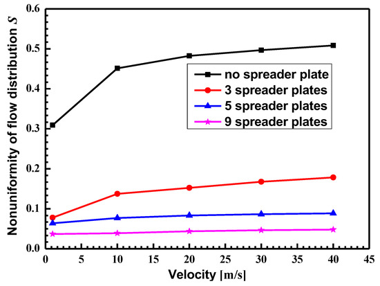 Figure 12 shows the nonuniformity variation in the total flow distribution with the inlet velocity under different spreader plates. With an increase in the number of spreader plates, the nonuniformity of the flow distribution decreased, indicating that the uniform flow distribution corresponded with the smaller flow rate and dispersion of the average flow in the channel. With an increase in the inlet flow rate, the nonuniformity of the flow distribution of each model increased. The nonuniformity of the flow distribution with no spreader plates and three spreader plates varied greatly with the velocity, but with five and nine spreader plates it only varied slightly. When the number of spreader plates reached nine, the flow distribution in the channel was less than 5%, indicating that the flow distribution was very uniform.