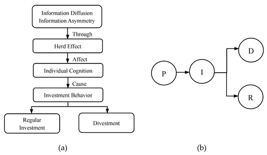 (a) The contagion mechanism of investment decisions. (b) The diffusion process of an Internet investment product (IIP).