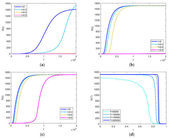 In this section, we study how the independent acceptance willingness interferes with the impact of the herding tendency. In our model, herding tendency is measured by , the weight of herding mentality, and it is positively correlated to the tendency to follow the decision of the crowd. The changes of the numbers of R nodes with different herding tendencies are plotted in Figure 3.