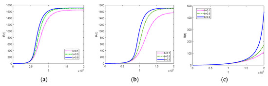 Now, we focus on the influence of the clustering coefficient, which is represented by parameter b, with a different herding tendency τ. The numerical results are plotted in Figure 4.