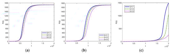 Comparing Figure 5a–c, conclusions similar to those made in Section 3.2 can be obtained. The increase in herding coefficient amplifies the negative effect of the modularity. In other words, the increase in Q causes more severe reductions in both diffusion speed and diffusion scope when a larger herding coefficient is involved.