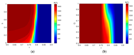 In this section, we investigate the mutual effect of the herd effect and network structure on the final diffusion scope. Firstly, the contour plot of R(T) with changing τ and the clustering coefficient is depicted in Figure 6a. The results show that with the increase of the clustering coefficient, the effective range of τ shrinks, and the threshold of the herding tendency having an effect on the outbreak size increases. Such findings suggest that networks with high clustering coefficients have more tolerance towards the herding tendency of the crowd. The increase in herding propensity has a more severe negative impact on networks with lower clustering coefficients.