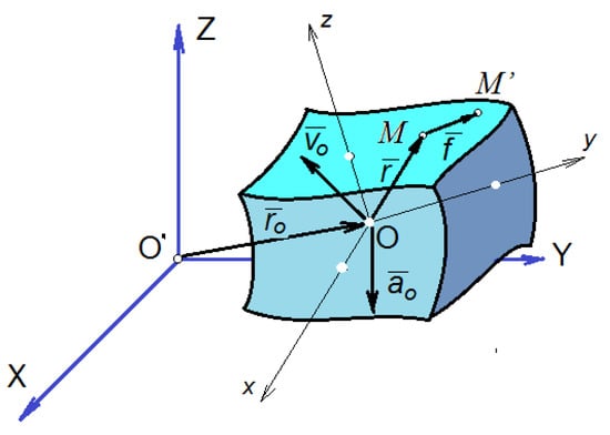Now consider a finite element modeling a domain of an elastic element from the structure of a multibody system. The aim of the paper is to determine the motion equations of this element. The generalized coordinates will be the displacements of the nodes. The displacements of an arbitrary point of the continuous domain modeled by the finite element shall be expressed using a finite number of nodal coordinates. The finite element shall be related to the mobile reference frame, which participates in the general rigid motion (Figure 1). With , we shall note the velocity, and with , the acceleration of the origin of the local reference frame relative to the global reference frame OXYZ. We shall note with the angular velocity and with the angular acceleration. Generally, a multibody system consists of several solids. Every solid is characterized by these two vectors, and the number of pairs of such vectors is equal to the number of distinct bodies. The relations between the components of a vector in the local coordinate system and the components of the same vector in a global coordinate system are obtained using a matrix of rotation :