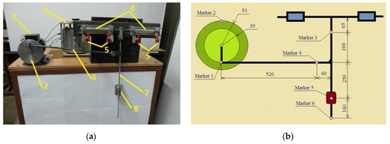 (a) Experimental test stand and (b) sketch of the mechanism with the positioning of the markers (dimensions are in mm). 1—engine; 2—rotating disk; 3—invertor; 4—pumps; 5—valves; 6—rod; 7—pendulum rod; 8—weight.