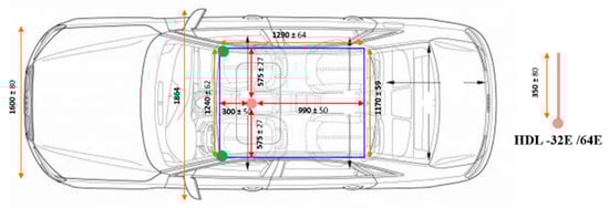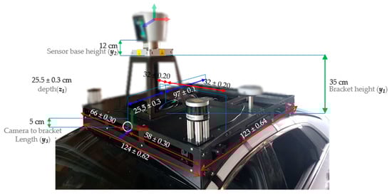 The calibration of LiDAR and the camera is performed in two consecutive steps in order to estimate the intrinsic and extrinsic calibration parameters. First, the camera intrinsic parameters are estimated by using the well-known checkerboard for the camera calibration method, and LiDAR and camera extrinsic parameters are obtained by using a planar 3D marker. The actual sensor placement on the roof of the vehicle is graphically illustrated in Figure 3, and the sensors were arranged as shown in Figure 4.