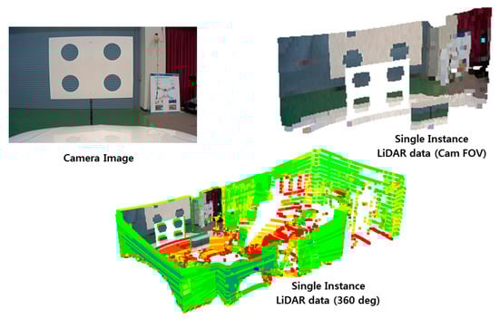 In order to fuse the camera and LiDAR data at the low-level, the first essential step of the fusion process is extrinsic calibration between sensors. This means that the geometrical parameters such as the position and orientation of each sensor must be determined by taking into account the relative position and orientation of the other sensors [10,11,12]. Therefore, calibration for fusing sensor data is performed by finding the correspondence between the 3D points and 2D image pixels. The important point for fusing heterogeneous sensor data is to identify the features from each sensor and determine the geometric relation between the sensors [13]. A normal solution is to recognize a target with heterogeneous sensors and then match the data collected from different angles and positions.