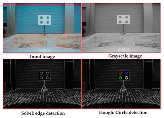 Marker detection in the camera images is performed using the Sobel edge detection operator, after which the circles are detected by using the Hough transform described in [38]. Finally, the four circles are centered, and the radius is verified. Figure 9 presents the circles detected in the camera image.