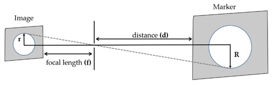 Before computing the components of the translational vector , is computed using the camera focal length f, and circle radius R and r estimated from the point cloud and image, respectively, where d is the distance to the marker, as shown in Figure 10.