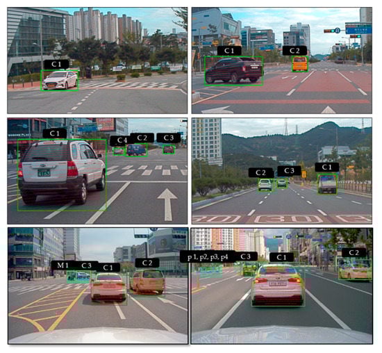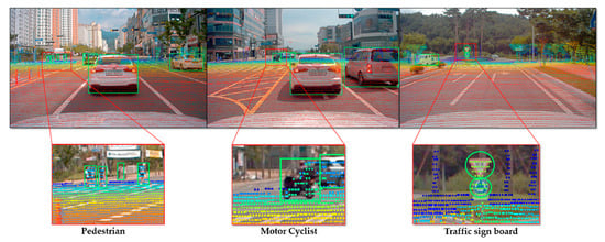 Figure 11 shows the output of the camera and LiDAR sensor using the calibration parameters along with image-based object detection and classification. The upper images in Figure 11 show all the LiDAR points projected on the image, and the lower images in the figure describe only points within the bounding box of detected objects.