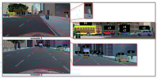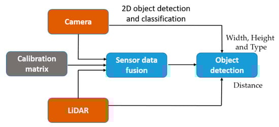 The purpose of the sensor fusion approach is to estimate the object distance by utilizing the camera and LiDAR sensor data. Figure 12 presents the overview of the object distance estimation and Figure 13 shows the fusion results of object detection and classification results from the camera and sensor calibration output of LiDAR 3D points. From the sensor fusion result, the depth of the object is calculated from the calibrated LiDAR 3D points aligned inside the bounding box detected from the camera. Object detection in the camera follows the approach presented in the paper [40,41], we have utilized the source code shared on GitHub [42] without any modification.