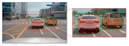 Each detected is represented in the bounding box with as shown in Figure 13. Projected LiDAR points inside the bounding box are extracted to estimate the distance of the detected object using Equation (12).