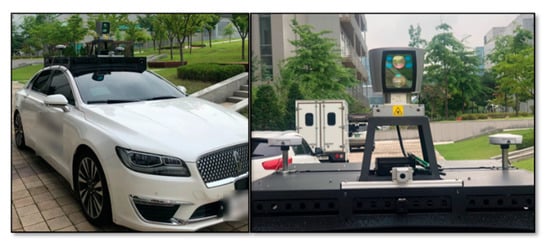 As shown in Figure 5, sensors were mounted rigidly on the top of the vehicle with mutual displacement. A Velodyne HDL 64E-S2 (Velodyne, San Jose, CA, USA) model LiDAR sensor and Sekonix SF3321 model of camera for video streaming were utilized in this work. The image data captured from the camera are represented by using a 2D coordinate system (U,V) and the 3D point cloud generated from the raw measurement of LiDAR sensors is presented by applying a 3D coordinate system (X,Y,Z). The main objective of the camera and LiDAR calibration is to compute the projective transformation matrix, which will project the 3D LiDAR points (X,Y,Z) onto the 2D image (U,V). The projective transformation matrix can be formulated as in Equation (1):