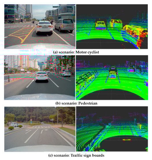 Autonomous vehicles use various sensors, such as LiDAR, radar, cameras, and ultrasonic sensors, to map and recognize the environment surrounding the vehicle [5]. In this field, sensor fusion techniques, in particular, have been proposed for object detection, and in other areas such as localization and path planning. For instance, conventional LiDAR and radar fusion focus on detecting moving objects such as vehicles and motorcycles. At that time, for the object detection, the velocity is fused using Doppler information extracted from radar and the width and length of vehicles obtained from LiDAR. In the article [6], the authors introduced RoadPlot-DATMO for moving object detection using multiple LiDAR sensors. However, multiple LiDAR sensor-based object detection and tracking were limited by object classification ability. Among the more recent approaches, the stereo-vision based method seems to be more suitable for generic object detection because of its ability to represent a scene in 3D but real-time performance is a critical issue [7]. In addition, the collaborative fusion between the laser scanner and camera approach presented in [8] limited to vehicle detection, though it is difficult to detect static objects such as pedestrians, motorcyclists, and so on.