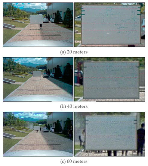 Tracking and estimating the distance of stationary and moving objects are a critical functionality of autonomous driving technology. In this evaluation, the accuracy of the data fusion method was verified by considering factors related to the distance of objects. The evaluation results presented in the table are the results of a statistical analysis of the data fusion accuracy when the distance of an object is varied, as shown in Figure 16.