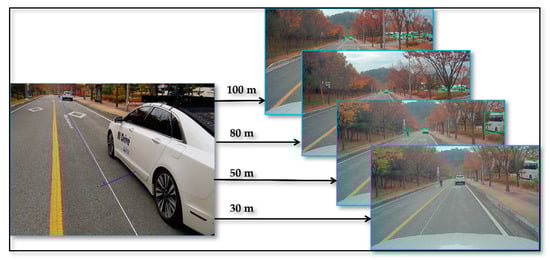 In this analysis, the performance of the proposed sensor fusion method compared with the exiting single sensor-based object detection methods. The main scope of this analysis is to verify the significance of the sensor fusion approach for object distance estimation. For the experiment, we have used a set of scenarios by varying objects (car and pedestrian) distances at 30, 50, 80, and 100 m as shown in Figure 18. Due to the complexity in estimating the ground truth, the experiment was conducted with a limited number of objects and types (car and pedestrian). If we extend the experimental scenario to more general road conditions, the object detection rate decreases, whereas the accuracy of distance estimation remains unchanged with respect to the number and types of objects. Hence, distance accuracy analysis presented in Table 3, Table 4 and Table 5 remains the same for even more general road scenarios.