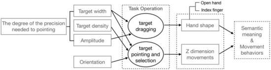 In this study, two experiments were conducted to help investigate the semantic meaning of the hand shape and the Z-dimension movements when pointing to targets by freehand, including different width, density, and direction. From the findings, we summarize practical implications for improving the efficiency of freehand pointing and hand interaction without additional cognitive burden. The block diagram of the proposed research is shown in Figure 1.