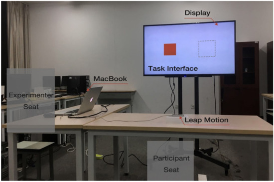 The participants were seated before a rectangular table facing the display. The distance between the participants and the display was about 1500 mm. The height between the bottom of the display and the floor was around 800 mm. A Leap Motion (60 fps, precision: 0.01 mm) was placed in front of the participants on the rectangular table. The gestures of the participants were captured by the Leap Motion sensor. The experiment environment is shown in Figure 3.