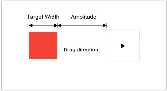 The smallest target width was 10 mm because a target smaller than this was difficult to select. The largest target width and amplitude were 400 mm due to the width of the display used in the experiment. The intermediate widths and amplitude were almost the quartiles or mean. The presentation order of target widths and amplitudes was randomized.