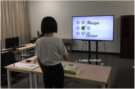 The participants were given an introduction of the task and filled out a questionnaire with personal information at the beginning of the study. After that, they were instructed to stand in front of the display and used their right hand to initiate the interaction. Each participant had one block to practice. By means of the practicing, the experimenter could help adjust the Leap Motion sensor to make sure that the participant could control the cursor comfortably. The participants were asked not to aim for fast selection and accuracy, but to move the cursor to the center of the target. Each participant had to complete eight blocks and had at least five minutes to rest their arms and eyes between each block. At the end of the experiment, the participants were encouraged to comment on the interactive technique and tasks. It took each participant about two hours on average to complete all tasks.