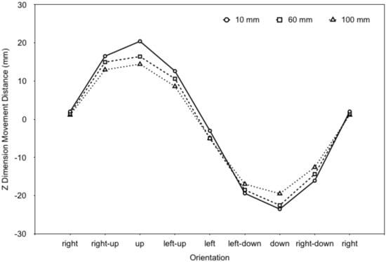 - Orientation has a significant effect on hand motion in the Z-dimension (Figure 6). We can use this relationship to predict the Z-dimension movement distance when moving in different directions. That is, when using the Z-dimension movement distance as a command attribute, the orientation has to be taken into account.