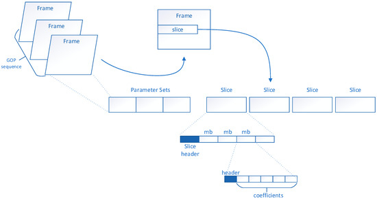 Data hierarchy in a video stream. Figure 1 contains three different types of frames (I-frame, P-frame and B-frame). Among them, I frames are encoded independently of other images. P-frames are encoded using the predictions of previous I or P-frames. B frames use double prediction of the previous and next I or P frames. The GOP sequence takes I frame as a start frame, and it is a periodic sequence. Each frame is sliced to limit error transmission.